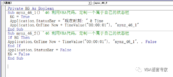 我们这一讲就将利用代码完成一个我们自己专属状态栏的工作,在这个状态栏上显示时间。下面看我们的代码:Private KG As BooleanSub mynz_46_1() '46利用VBA代码,定制一个属于自己的状态栏 KG = True Application.StatusBar = "现在时刻: " & Time Application.OnTime Now + TimeValue("00:00:01"), "mynz_46_1"End SubSub mynz_46_2() '46利用VBA代码,定制一个属于自己的状态栏If KG ThenApplication.OnTime Now + TimeValue("00:00:01"), "mynz_46_1", , FalseEnd IfApplication.StatusBar = FalseKG = FalseEnd Sub代码截图: