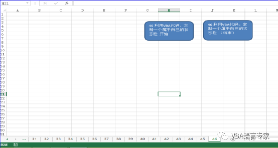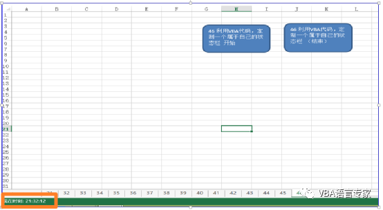 代码讲解:上述代码将在工作表的状态栏上提示一个时间。1)当执行mynz_46_1时,将在状态栏上显示一个时间这个时间是time函数提供的,每个一秒钟再次刷新时间。2)在执行mynz_46_1时将模块的变量KG设置成TRUE,表示开始显示时间。3)刷新时间是通过利用Application对象的OnTime方法来完成的。4)当点击mynz_46_2时停止Application对象的OnTime方法5)当点击mynz_46_2时恢复状态栏。 下面看代码的运行:运行前:运行: 今日内容回向:1 on time方法 的作用是什么?2 kg 变量的作用是什么? 本讲内容参考程序文件:VBA代码解决方案修订(1-48).xlsm 我20多年的VBA实践经验,全部浓缩在下面的各个教程中:【分享成果,随喜正能量】人世间,遇见千千万万,都不如探寻真实喜悦的自己。愿你,活成清欢,活成四季,淡若秋水,静无涟漪。。