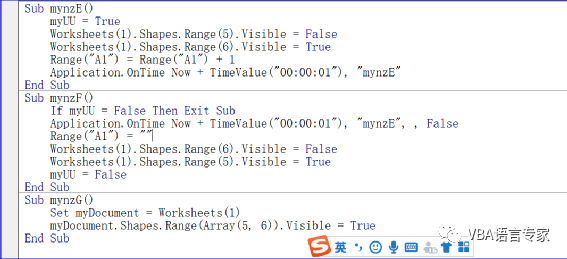 如何避免这种意外出现呢?我们要设置当预设开启后,才能取消,如果没有预设是无法取消的。我们看下的完整代码,这段代码是点击按钮mynzE后在“A1”单元格数字累加,点击mynzF按钮后停止。