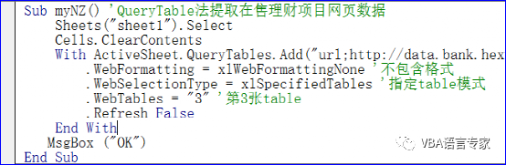 Sub myNZ() 'QueryTable法提取在售理财项目网页数据