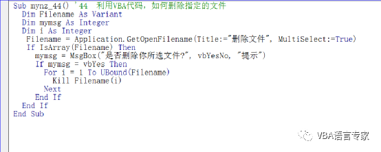 如果要删除某文件需要利用到KILL命名,下面我们看一段代码,利用GetOpenFilename方法和KILL命令来完成删除某文件的过程: Sub mynz_44() '44 利用VBA代码,如何删除指定的文件 Dim Filename As Variant Dim mymsg As Integer Dim i As Integer Filename = Application.GetOpenFilename(Title:="删除文件", MultiSelect:=True) If IsArray(Filename) Then mymsg = MsgBox("是否删除你所选文件?", vbYesNo, "提示") If mymsg = vbYes Then For i = 1 To UBound(Filename) Kill Filename(i) Next End If End If End Sub 代码窗口: 代码解析:mynz_44()过程使用GetOpenFilename方法显示标准的内置“打开”对话框,获取用户选定文件的文件名后使用Kill语句删除。a) 第5行代码显示标准的“打开”对话框,将对话框的标题设置为“删除文件”,将MultiSelect参数设置为True,允许选定多个文件。b) 第6行代码,获得返回值。当用户选定文件后,返回的是选定的文件名或用户输入的文件名。因为MultiSelect参数已设置为True,所以返回值将是一个包含所有选定文件名的数组(即使仅选定了一个文件名)。如果用户取消了对话框,则该值为False。c) 第8行到第12行代码,经询问用户后使用Kill语句从磁盘中删除用户选定的文件。运行mynz_44过程,显示标准的内置“打开”对话框,删除用户选定的文件. l特别提示2: VBA中数组下界默认从0开始,但使用GetOpenFilename方法选择多个文件时返回的包含选定文件名的数组下界是从1开始。 下面实测上述代码,运行后弹出删除文件对话框:选择文件后,选择打开:选择“是”之后,文件将被删除。 l特别提示3:此时删除文件时永久的删除,在回收站中是看不到的。 今日内容回向: 1 GetOpenFilename方法的意义是什么? 2 如何完成删除文件的过程? 3 上面的内容中有三个特别提示,是否理解呢? 本讲内容参考程序文件:VBA代码解决方案修订(1-48).xlsm 我20多年的VBA实践经验,全部浓缩在下面的各个教程中:【分享成果,随喜正能量】有时候觉得遇到麻烦,其实是跟自己过不去,该发生的已经发生,该面对的始终要面对,该承担的始终要承担。。