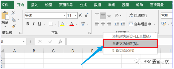 1)在功能区上的任意位置单击鼠标右键,然后单击“自定义功能区”。