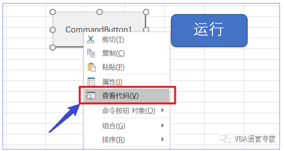 1)右键单击命令按钮1(确保选择了设计模式)。