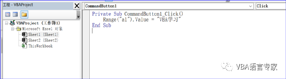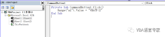 3) 将光标放在Private Sub CommandButton1_Click()和End Sub之间。