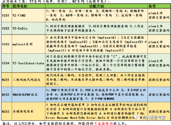 VBA技术工具是我根据我的多年经验,并结合一些需求推出多项工具。这些工具分为YZ系列和NZ系列。YZ系列比较容易,一般可以通过教程中的代码组合自己也可以容易的写出;NZ系列则比较困难些,需要一定的VBA技术能力可以得到。这些工具只对学员,不对外。