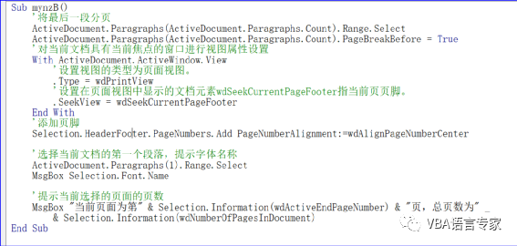 MsgBox "当前页面为第" & Selection.Information(wdActiveEndPageNumber) & "页,总页数为" _