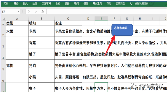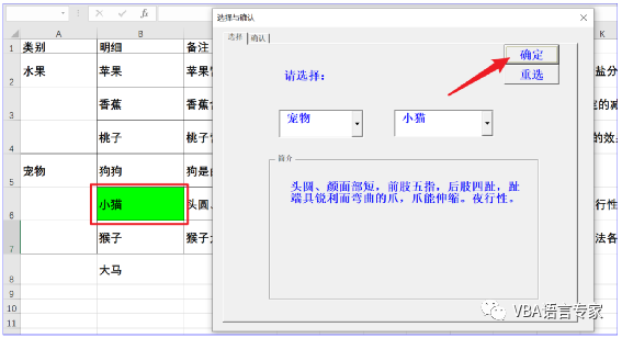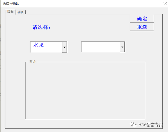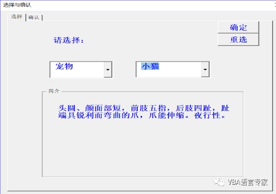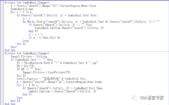1)窗体的弹出,在工作表中点击“选择和确认”按钮将弹出窗体:Sub mynzE() UserForm6.ShowEnd Sub 2)复选框ComboBox1的改变事件,在这个事件中我们将清空ComboBox2,同时将ComboBox2根据ComboBox1的项目加载相应的项目。注意下面代码的写法。Private Sub ComboBox1_Change() k = Sheets("sheet6").Range("A1").CurrentRegion.Rows.Count ComboBox2.Clear For i = 2 To k If Sheets("sheet6").Cells(i, 1) = ComboBox1.Text Then n = i Do While Sheets("sheet6").Cells(n, 1) = ComboBox1.Text Or Sheets("sheet6").Cells(n, 1) = "" If Sheets("sheet6").Cells(n, 2) <> "" Then ComboBox2.AddItem Sheets("sheet6").Cells(n, 2) End If n = n + 1 If n > k Then Exit Do Loop End If NextEnd Sub 3)复选框ComboBox2的改变事件,在这个事件中我们将首先清空原有的图片,并判断需要加载的图片是否存在,如果存在加载这个图片,加载图片用的是Image1.Picture = LoadPicture(YY),同时根据选项给简介栏添加备注内容。在确认窗口提示所选的内容。Private Sub ComboBox2_Change() Image1.Picture = Nothing If ComboBox2.Text <> "" Then YY = ThisWorkbook.Path & "\" & ComboBox2.Text & ".jpg" RR = Dir(YY) If RR <> "" ThenImage1.Picture = LoadPicture(YY) End If Label1.Caption = "您选择的是" & ComboBox2.Text k = Sheets("sheet6").Range("A1").CurrentRegion.Rows.Count For i = 2 To k If Sheets("sheet6").Cells(i, 2) = ComboBox2.Text Then Label2.Caption = Sheets("sheet6").Cells(i, 3) End If Next End IfEnd Sub 4)命令按钮“确定”的单击事件,在这个事件中先在工作表中找到ComboBox2的值,然后改变单元格的颜色。Private Sub CommandButton1_Click() k = Sheets("sheet6").Range("A1").CurrentRegion.Rows.Count For i = 1 To k If Sheets("sheet6").Cells(i, 2) = ComboBox2.Text Then Sheets("sheet6").Cells(i, 2).Interior.ColorIndex = 4 End If NextEnd Sub 5)命令按钮“重选”的单击事件,在这个事件中要将工作表还原原有的颜色。Private Sub CommandButton2_Click() Sheets("sheet6").Range("A1").CurrentRegion.Interior.ColorIndex = 0End Sub 6)窗体的加载事件,这个事件中要先清空ComboBox2,加载ComboBox1的选项。Private Sub UserForm_Initialize() Sheets("sheet6").Range("A1").CurrentRegion.Interior.ColorIndex = 0 k = Sheets("sheet6").Range("A1").CurrentRegion.Rows.Count ComboBox2.Clear With ComboBox1 For i = 2 To k If Sheets("sheet6").Cells(i, 1) <> "" Then .AddItem Sheets("sheet6").Cells(i, 1).Value End If Next .Text = .List(0) End WithEnd Sub 代码的截图: