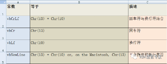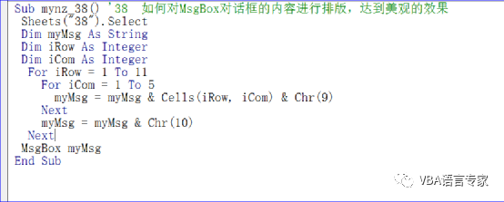 如下面代码所示。Sub mynz_38() '38 如何对MsgBox对话框的内容进行排版,达到美观的效果 Sheets("38").Select Dim myMsg As String Dim iRow As Integer Dim iCom As Integer For iRow = 1 To 11 For iCom = 1 To 5 myMsg = myMsg & Cells(iRow, iCom) & Chr(9) Next myMsg = myMsg & Chr(10) Next MsgBox myMsgEnd Sub 代码解读: 代码解析:mynz_38过程使用两层循环读取当前工作表中A1到E11单元格的内容,并用消息框显示出来。1)第7行代码,iCom循环中在把逐列读取的单元格内容赋给变量mysMsg时插入一个制表符(Chr(9)),对列进行分隔。2)第9行代码,iRow循环中在读取下一行单元格内容赋给变量myMsg时插入一个换行符(Chr(10)),对行进行换行。3) 运行mynz_38过程将用消息框显示当前工作表中A1至E11单元格区域中的内容,并排列整齐. 再看看运行后的窗口: 这样在运行后弹出的窗口就非常的漂亮了。 今日内容回向:1 Chr(13) 是什么意义?2 Chr(10) 是什么意义?3 Chr(9) 是什么意义? 本讲内容参考程序文件:VBA代码解决方案修订(1-48).xlsm 我20多年的VBA实践经验,全部浓缩在下面的各个教程中:【分享成果,随喜正能量】有缘分,不拒绝,无缘分,不奢求。来的,欢迎,去的,相送。随缘不变,不变随缘。随遇而安,自在安然。放得下,才能更好地拿得起。