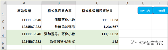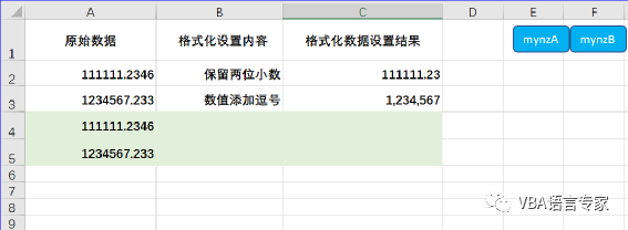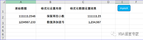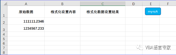 在这个实例中我们利用VBA完成单元格的数字格式属性设置。在此示例中,我们希望将单元格C2的十进制小数点位数设置为2,单元格C3添加逗号,使其更具可读性。C1和C2单元格的值都等于响应A列单元格的值。原始数据如下截图: