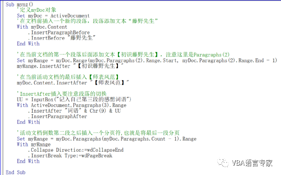 以上代码首先要求用户输入一个词语,这个词语会添加在Paragraphs(3).Range,但要注意是添加在了段落标识符的前面,随后又加入了一个段落标识。
