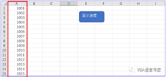 1)为了用进度条来显示上述的进度,我们要评估一下进度百分比实现的规则,由于实现的是从1到100行的测试,每个单元格实现行号与1到1000值的累加,我们不妨以行数作为百分比进度的基准,填充到多少行就是进度的百分数。