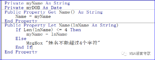 我们将它的声明按照Gender属性的方式从Public(公有)改为Private(私有),同时使用变量命名规则将Name改名为myName。如下的代码:Private myName as String有了这样的一个私有模块级变量后,我们就有了一个存储属性数据的宿主(或者称之为容器)接下来,我们要定义Name(姓名)的读取属性(Property Get)Public Property Get Name() As String Name = myNameEnd Property其实这里代码的意义就是将宿主myName中的数据传递给Name的过程。接下来我们为Name(姓名)定义赋值属性(Property Let)。设计之前,我们要考虑下,是否要对Name赋值的时候,做任何约束。比如,是否要检查一下赋值的有效性?一般中国人的姓名都在4个字以下,对超过4个字的情况,是否要弹出错误提示框?另外,姓名被赋值一次后,是否允许再被第二次赋值?这些都是在设计之前要考虑的问题。这里我们就只检查一下超过4个字的情况。 Public Property Let Name(lnName As String) If Len(lnName) <= 4 Then myName = lnName Else MsgBox "姓名不能超过4个字符" End IfEnd Property代码截图:代码的解析:上述代码为name属性赋值,赋值是将一个变量传递进来,所以我用了lnName这样的变量作为传入的数据,传入数据后我要对数据进行校验。如果校验通过,那么将传进来的数据放到宿主中,以便在读取的时候取出。如果不通过则提示给用户信息。