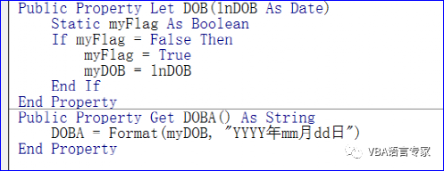 代码如下:Public Property Get DOBA() As String DOBA = Format(myDOB, "YYYY年mm月dd日")End Property 代码解读:看到我上面的代码,细心的朋友会发现,老师,怎么又多了一个DOBA的属性啊?对的,我们特意增加的,那么为什么不直接用DOB这个属性呢?这个问题在本讲的最后会给大家以解答,这里可以先思考一下。这里DOB和DOBA就是两个不同名字的属性,它们都是围绕着类的私有变量myDOB来读写。DOB只定义成赋值属性,只能出现在赋值号(=)左边,否则的话,编译报错:属性的无效使用。DOBA定义成了读取属性,只能出现在赋值号(=)右边,否则的话,编译报错:不能给只读属性赋值。我们也可以将DOB理解为只写属性,DOBA理解为只读属性。这样对于上一讲的内容关于使用Property Get 和 Property Let(set)的灵活性方面,这讲也进行了讲解。好了,我们下一讲继续。 今日内容回向:1 如何设置真正的“只赋值一次”的属性?2 为什么要引入DOBA的属性呢? 本讲内容参考程序文件:VBA-CLASS(32-33).xlsm 我20多年的VBA实践经验,全部浓缩在下面的各个教程中:【分享成果,随喜正能量】不迎合他人的期待,只追寻自己的热爱,她是持续突破自我的音乐创作者。金典携手品牌代言人@李宇春 ,邀你一起,跟着自然的节奏,找到自己的节拍,在生活的舞台,活出你要的自在。