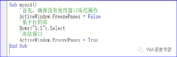代码讲解:代码非常的简单,先确保当前窗口没有使用窗口的冻结操作,然后选择基准行,最后冻结窗格。