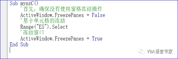 Range("E5").Select 这句代码是指定了冻结窗格的基准为“E5”单元格。