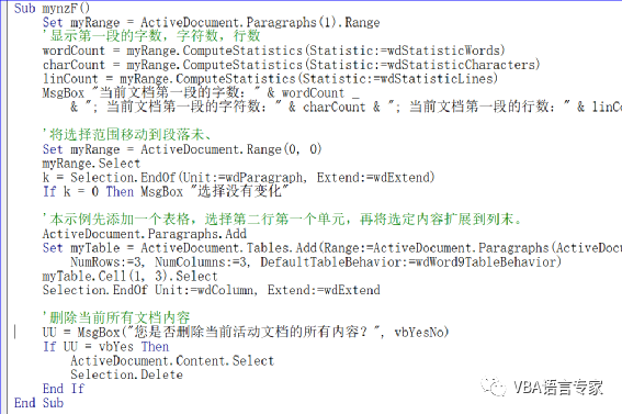 以上代码首先将第一个段落赋给myRange变量,然后利用三个变量分别取得这个变量的字数,字符数,和行数,最后用对话框提示给用户。