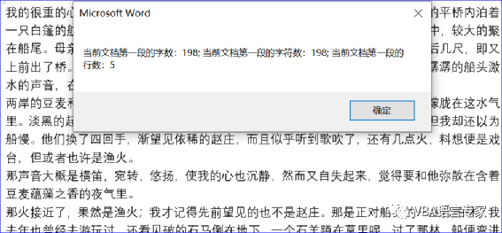 & "; 当前文档第一段的字符数:" & charCount & "; 当前文档第一段的行数:" & linCount