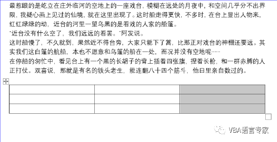 以上代码首先添加一个新的段落,然后在这个段落中插入表格,并选择第三行第一列的单元格,最后将这个单元格扩展都整列。