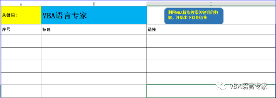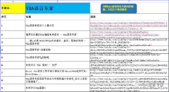 实现的场景:如下图当我们点击右侧的按钮“利用VBA提取搜索关键词的数据,并给出下载的链接”时能够在下面的数据区域给出查询到的结果。