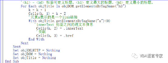 9) For Each objTitle In objDOM.getElementsByTagName("h3") 在每个H3标签即标题进行遍历操作。注意