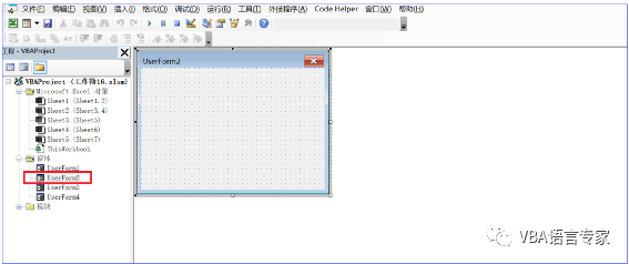 在VBE窗口插入一个新的窗体UserForm2,这个窗体将响应点击事件。如下界面: