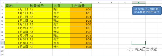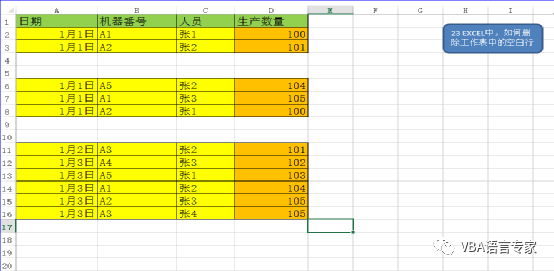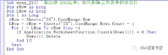 下面我们将就实际的应用来讲解如何应用DELETE方法,这个方法也是VBA中应用中的非常广泛的。可以用于VALUE的删除,也可以用于格式的删除,还可以用于行的删除等等,今日讲解的就是行的删除。要根据具体的条件来选择删除的对象,这就要根据实际问题的来做具体的判断,这里我要讲解的是“如何删除空白行”,这个问题。这个问题也是在实际工作中应用的最为广泛的方法。下面我们看代码:Sub mynz_23() '第23讲 EXCEL中,如何删除工作表中的空白行Dim rRow As LongDim LRow As LongDim i As LongrRow = Sheets("23").UsedRange.Row LRow = rRow + Sheets("23").UsedRange.Rows.Count - 1 For i = LRow To rRow Step -1 If Application.WorksheetFunction.CountA(Rows(i)) = 0 Then Rows(i).Delete End If Next End Sub代码窗口: