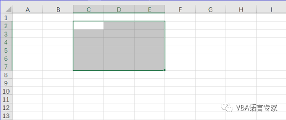 在此过程中,我们可以选择连续行和列中的一个单元格或多个单元格。此连续选择称为范围"Range"。"Range"是一个非常重要的概念,通常通过左侧上角的开始单元的引用和右下角的末尾单元的引用来识别。例如,下图中Range为从 C2到E7,选择了此范围中的所有单元格。