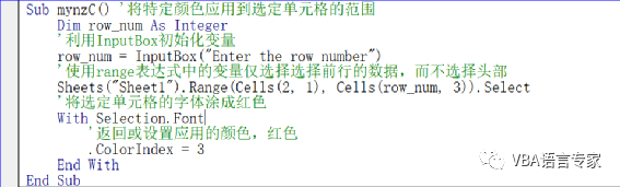 变量来设置单元格的范围,然后利用范围表达式的第二种方案来获得此范围的选择,并改变字体的颜色。