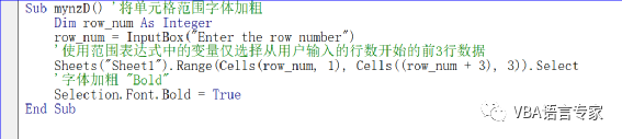 下面的例子是使用单元格范围表达式执行操作的示例。在这里,我们将所选单元格的字体加粗。