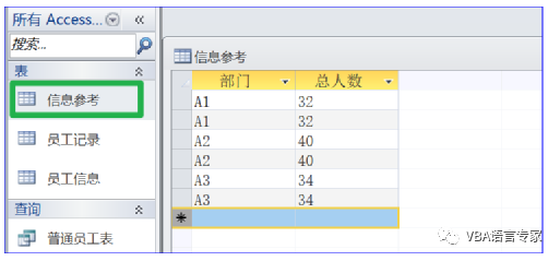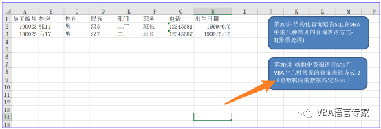 其中,”查询表达式”可以是下列之一或其组合,或者多种方式的组合,用逗号搁开:(1)星号(*)表示“数据源”的所有字段。(2)字段名(3)常量表达式(4)任何有效的计算表达方式这类查询的SQL语句我们已经用了非常多了:如 strSQL = "SELECT * FROM 员工信息"l注意点:1) 有时使用AS重新命名字段名称 当查询表达式使用“字段名”时,字段名就是其本身,使用“常量表达式”和“任何有效的计算表达方式”时,系统将为该字段重新命名一个字段名,这个字段名通常没有意义,这时可以在表达式中使用AS为字段重新命名,当然对字段名也可以通过使用AS为其重新命名。AS并不对查询结果造成实质影响。下面是使用AS的一个例子:strSQL = "Select 班级,姓名 AS 名字,语文+数学+英语 AS 总成绩 from员工信息"2) 使用DISTINCT删除重复记录例如:在“员工信息”表中有重复记录,如果希望若干重复的记录只显示一条,可以使用DISTINCT进行限定。 strSQL = "Select distinct * from 员工信息"例如:数据库中信息参考表内容如下:上述数据中很多是有重复的。我们可以用下面的代码进行排重处理:Sub mynz_20_1() '有重复数据,排重 第20讲 结构化查询语言SQL在VBA中的几种常见的查询表达方式Dim cnADO, rsADO As Object Dim strPath, strSQL As String Dim i As Integer Set cnADO = CreateObject("ADODB.Connection") Set rsADO = CreateObject("ADODB.RecordSet") strPath = ThisWorkbook.Path & "\mydata2.accdb" cnADO.Open "Provider=Microsoft.ACE.OLEDB.12.0;Data Source=" & strPath 'strSQL = "SELECT * FROM 信息参考" strSQL = "Select distinct * from 信息参考" rsADO.Open strSQL, cnADO, 1, 3 Sheets("20").Select Cells.ClearContents For i = 0 To rsADO.Fields.Count - 1 Sheets("20").Cells(1, i + 1) = rsADO.Fields(i).Name Next i For i = 1 To rsADO.RecordCount For j = 0 To rsADO.Fields.Count - 1 Sheets("20").Cells(i + 1, j + 1) = rsADO.Fields(j) Next j rsADO.MoveNext Next i rsADO.Close cnADO.Close Set rsADO = Nothing Set cnADO = NothingEnd Sub部分代码截图: 运行后显示数据:
