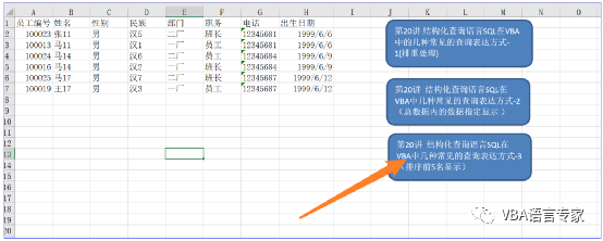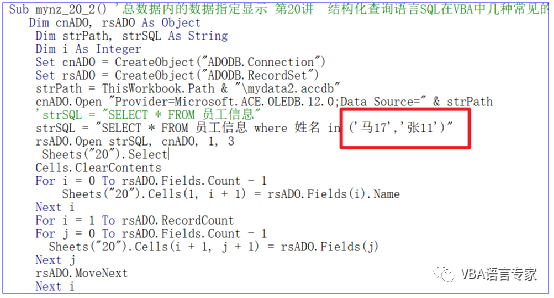 这种方式可以通过使用Where可以设置查询条件,查询的条件表达式可以是:(1)任何逻辑表达式 如:strSQL = "SELECT * FROM 员工信息 WHERE 部门='一厂'"这种查询在之前的讲解中讲过,这里不再举例。(2)IN/NOT IN ( 表达式1,表达式2,…. ) 注意上面的括号不可少,各表达式用逗号搁开。 '查询姓名在括号中列出名单范围内的人,如总数据如下:我们要显示的是姓名为马17和张11的信息,SQL语句如下:strSQL = "SELECT * FROM 员工信息 where 姓名 in ('马17','张11')" 代码如下:Sub mynz_20_2() '总数据内的数据指定显示 第20讲 结构化查询语言SQL在VBA中几种常见的查询表达方式 Dim cnADO, rsADO As Object Dim strPath, strSQL As String Dim i As Integer Set cnADO = CreateObject("ADODB.Connection") Set rsADO = CreateObject("ADODB.RecordSet") strPath = ThisWorkbook.Path & "\mydata2.accdb" cnADO.Open "Provider=Microsoft.ACE.OLEDB.12.0;Data Source=" & strPath 'strSQL = "SELECT * FROM 员工信息" strSQL = "SELECT * FROM 员工信息 where 姓名 in ('马17','张11')" rsADO.Open strSQL, cnADO, 1, 3 Sheets("20").Select Cells.ClearContents For i = 0 To rsADO.Fields.Count - 1 Sheets("20").Cells(1, i + 1) = rsADO.Fields(i).Name Next i For i = 1 To rsADO.RecordCount For j = 0 To rsADO.Fields.Count - 1 Sheets("20").Cells(i + 1, j + 1) = rsADO.Fields(j) Next j rsADO.MoveNext Next i rsADO.Close cnADO.Close Set rsADO = Nothing Set cnADO = NothingEnd Sub代码截图和运行结果如下图: