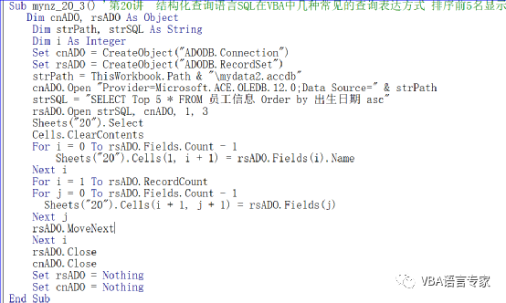 1) 可以使用Top限制返回行数,可以使用Top限制返回的行数。如:下面语句返回前2条记录: Sql = "Select top 2 * from 员工信息"2) 通过使用Order by可以对查询结果按一列或多列进行排序。'首先按语文成绩降序排列,语文成绩相同的按数学成绩升序排列 Sql = "Select * from学生信息Order by 语文 desc,数学 asc" 备注:ASC是升序排列,在不指定排序方式的情况下是默认的,因此可以省略. 如员工信息中我们要显示的是,按生日排序的前5人 SQL语句如下:strSQL = "SELECT Top 5 * FROM 员工信息 Order by 出生日期 asc" 代码:Sub mynz_20_3() '第20讲 结构化查询语言SQL在VBA中几种常见的查询表达方式 排序前5名显示 Dim cnADO, rsADO As Object Dim strPath, strSQL As String Dim i As Integer Set cnADO = CreateObject("ADODB.Connection") Set rsADO = CreateObject("ADODB.RecordSet") strPath = ThisWorkbook.Path & "\mydata2.accdb" cnADO.Open "Provider=Microsoft.ACE.OLEDB.12.0;Data Source=" & strPath strSQL = "SELECT Top 5 * FROM 员工信息 Order by 出生日期 asc" rsADO.Open strSQL, cnADO, 1, 3 Sheets("20").Select Cells.ClearContents For i = 0 To rsADO.Fields.Count - 1 Sheets("20").Cells(1, i + 1) = rsADO.Fields(i).Name Next i For i = 1 To rsADO.RecordCount For j = 0 To rsADO.Fields.Count - 1 Sheets("20").Cells(i + 1, j + 1) = rsADO.Fields(j) Next j rsADO.MoveNext Next i rsADO.Close cnADO.Close Set rsADO = Nothing Set cnADO = NothingEnd Sub代码截图: 显示的结果: 今日内容回向:1 本讲讲了几种常用的SQL查询,读者是否明白?2 上述实例希望读者能自己亲自操作一下。