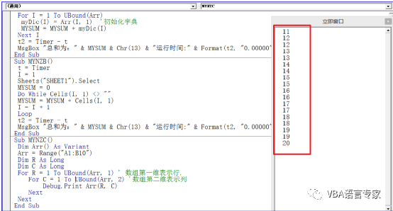 利用上述方案将工作表中的数据引入VBA数组后,我们要注意该数组始终是二维的。第一个维度是行,第二个维度是列。因此,下面的例子:Dim Arr() As Variant Arr = Range("A1:C5")Arr被隐式地调整为Arr(1 to 5,1 to 3),其中5是行数,3是列数。即使工作表数据位于一行或一列(例如,Arr(1 to 10,1 to 1))中,也会创建二维数组。加载工作表数据的数组始终具有等于1的下限(LBound),而不管模块中可能具有什么选项基指令。你不能改变这种行为。例如: Dim Arr() As Variant Arr = Range("A1:A10")这里,Arr由VBA自动标注为Arr(1 to 10,1 to 1)。您可以使用如下代码在工作表值数组中循环:Sub MYNZC() Dim Arr() As Variant Arr = Range("A1:B10") Dim R As Long Dim C As Long For R = 1 To UBound(Arr, 1) ' 数组第一维表示行. For C = 1 To UBound(Arr, 2) '数组第二维表示列 Debug.Print Arr(R, C) Next NextEnd Sub代码截图:代码的运行: