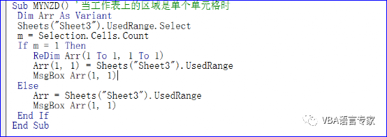 在将指定的范围数据引入数组时很多的时候我们会遇到一种特例,就是只有一个单元格,这个时候往往利用上述方法会报错,有的时候是数组的赋值报错,有的时候是数组的上下标报错,视具体的代码应用而定。这个错误该该如何处理呢?我们可以利用下面的代码: Sub MYNZD() '当工作表上的区域是单个单元格时 Dim Arr As Variant Sheets("Sheet3").UsedRange.Select m = Selection.Cells.Count If m = 1 Then ReDim Arr(1 To 1, 1 To 1) Arr(1, 1) = Sheets("Sheet3").UsedRange MsgBox Arr(1, 1) Else Arr = Sheets("Sheet3").UsedRange MsgBox Arr(1, 1) End IfEnd Sub代码截图: 上面的代码成功的避免了这种错误。大家在利用这种数组赋值时避免这类错误的发生。 本节知识点回向:读取指定范围的数据到数组有哪些方法可以利用?读取后的数组是几维数组?如何避免指定范围只有一个单元格的情况? 本专题参考程序文件:004工作表.XLSM