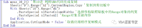 上面过程将Sheets("9")工作表中A1单元格的当前区域复制到Sheets("10")工作表中以A1单元格为左上角单元格的区域