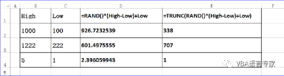 返回到数字之间的十进制数整数(不带小数部分的整数),可以使用:=TRUNC(RAND()*(High-Low)+Low)