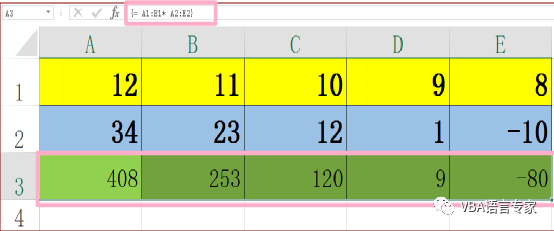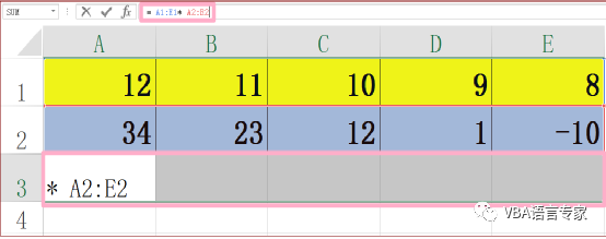 如下面的截图,用数组公式计算两个数据区域A1:E1和A2:E2的乘积放在A3:E3的区域内: