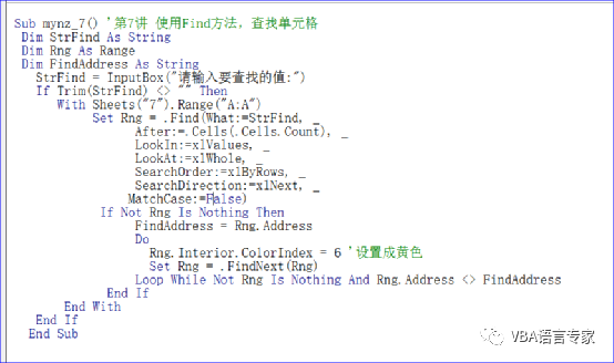 Sub mynz_7() '第7讲 使用Find方法,查找单元格 Dim StrFind As String Dim Rng As Range Dim FindAddress As String StrFind = InputBox("请输入要查找的值:") If Trim(StrFind) <> "" Then With Sheets("7").Range("A:A") Set Rng = .Find(What:=StrFind, _ After:=.Cells(.Cells.Count), _ LookIn:=xlValues, _ LookAt:=xlWhole, _ SearchOrder:=xlByRows, _ SearchDirection:=xlNext, _ MatchCase:=False) If Not Rng Is Nothing Then FindAddress = Rng.Address Do Rng.Interior.ColorIndex = 6 '设置成黄色 Set Rng = .FindNext(Rng) Loop While Not Rng Is Nothing And Rng.Address <> FindAddress End If End With End If End Sub代码解析:RngFindNext过程在工作表Sheets(“7”)的A列中查找InputBox函数对话框中所输入的值,并将查到单元格底色设置成黄色。第8行到第17行代码使用Find方法在工作表Sheet1的A列中查找。第16行代码将查找到的第一个单元格地址赋给字符串变量FindAddress。第18行代码将查找到的单元格底色设置成黄色。第19行代码使用FindNext方法进行重复搜索。 lFindNext方法继续执行用Find方法启动的搜索。查找下一个匹配相同条件的单元格并返回代表单元格的Range对象,语法如下:expression.FindNext(After)参数1)expression是必需的,返回一个Range对象。2)After是可选的,指定一个单元格,查找将从该单元格之后开始。 第20行代码如果查找到的单元格地址等于字符串变量FindAddress所记录的地址,说明A列已搜索完毕,结束查找过程。3 VBA中利用FIND的代码实现多值查找的代码运行 1):代码截图: 2)开始运行: 3)返回结果: 今日内容回向: 1 FIND方法有哪些利用价值?2 如何实现多值的查找? 我20多年的VBA实践经验,全部浓缩在下面的各个教程中: 第7套教程(共三册):《VBA之EXCEL应用》:是对VBA基本的讲解第1套教程(共三册):《VBA代码解决方案》:是入门后的提高教程第4套教程(16G):VBA代码解决方案之视频(第一套的视频讲解)第3套教程(共两册):《VBA数组与字典解决方案》:是对数组和字典的专题讲解第2套教程(共两册):《VBA数据库解决方案》:是对数据库的专题讲解第6套教程(共两册):《VBA信息获取与处理》:讲解VBA的网络及跨程序应用第5套教程(共两册):VBA中类的解读和利用:类及接口技术的讲解第8套教程(共三册):VBA之Word应用(最新教程):word中VBA的利用 上述教程的学习顺序:① 7→1→3→2→6→5或者7→4→3→2→6→5。② 7→8 l如何学习VBA呢? 概括的说就是: 学习过程中要信、解、受、持,更要有回向的业力。无论您在学习的任何阶段,都要对照教程的知识点加持自己的实际工作,总会有丰厚的收获。