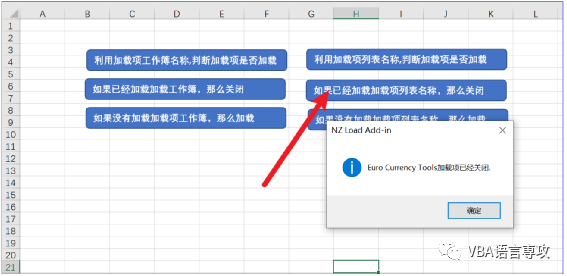 在程序中我们检测的是"nzAddIn.xlam"加载项工作簿,以及加载项列表名称为"nzAddIn"和"Euro Currency Tools"的项目,"Euro Currency Tools"是EXCEL自带的。"nzAddIn.xlam"和"nzAddIn"是我在程序中给出的测试文件,读者可以自己添加到加载项列表中。