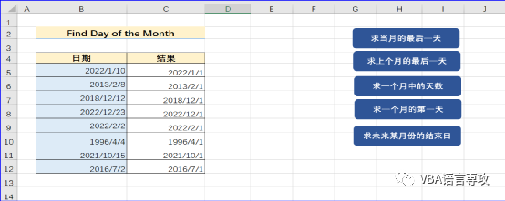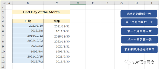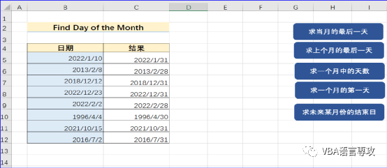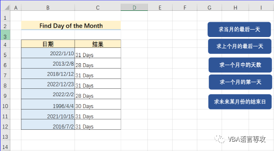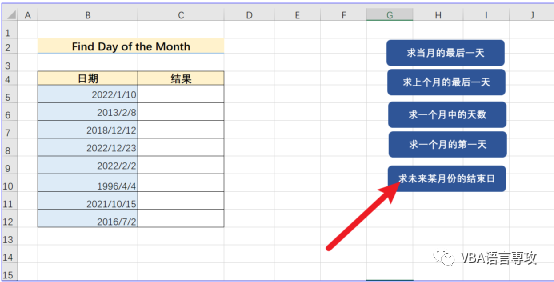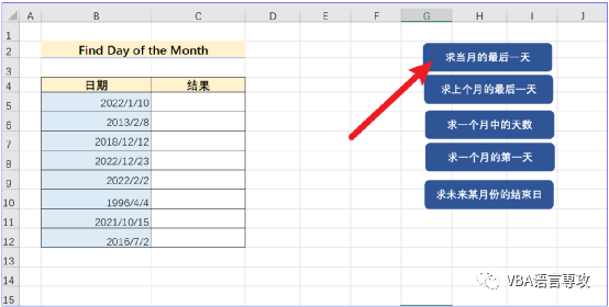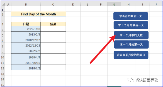 点击按钮后,会在C列给出B列日期月的最后一天,结果:
