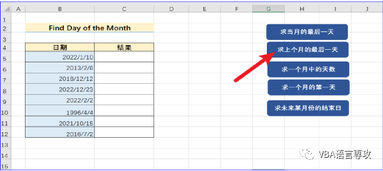 点击按钮后,会在C列给出B列日期月上月的最后一天。结果: