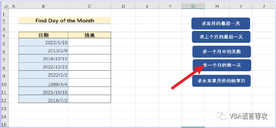点击按钮后,会在C列给出B列日期月的第一天日期。结果: