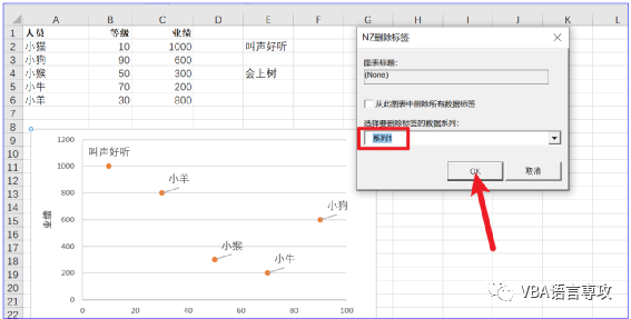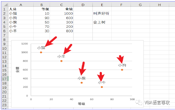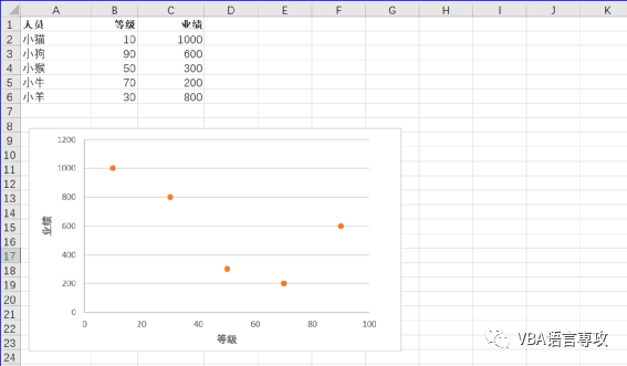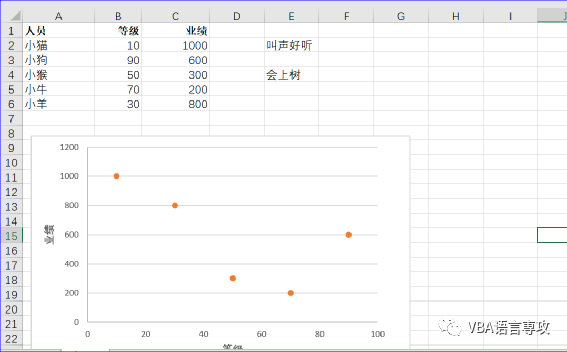 此时,各个数据对应的等级及业绩罗列分别在图表中展示了出来,但非常遗憾的是哪个点对应的是哪个人员无法在图表上显示。这是要在图表上使用标签了。