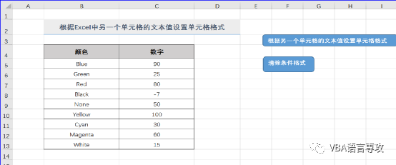 这部分的应用是根据Excel中另一个单元格的文本值设置单元格格式,看下面的截图: