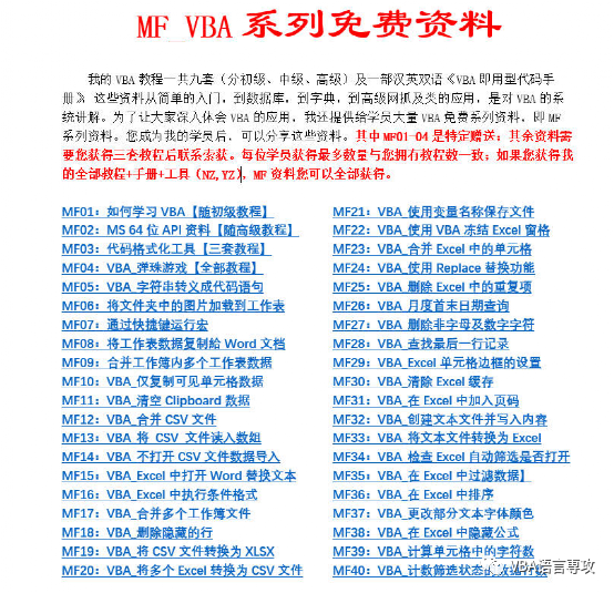 为了更好的完善学员的知识结构,及丰富学员的实践经验,我还会提供给大家更多的VBA工具,有较复杂些的NZ系列工具,较容易些的YZ系列,同时还有MF系列,这个系列是随教程赠送的,里面同样有很多实用技巧提供给大家。MF,YZ,NZ各个系列的工具,在平台上不会公布代码,学员可以根据自己的需要联系我选择。今日给大家介绍的是MF16:VBA_Excel中执行条件格式