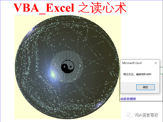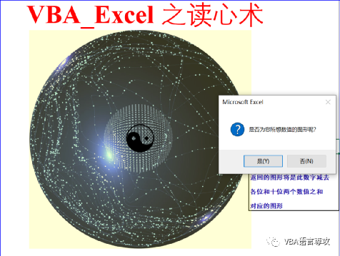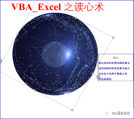 本应用中的知识点:① VBA如何驱动魔法球旋转 ②如何显示运行结果的图片 ③如何给出展示图片的展示效果(1秒钟) ④如何取得系列的图片 ⑤ 如何给图片随机排列 ⑥如何随机取得图片 ⑦ 形状如何隐藏及显示 ⑧ 全屏的设置 ⑨ 隐藏滚动条的设置