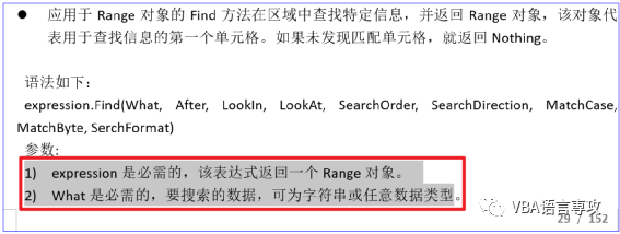 但是在实际应用中我们往往是不必要这么多的参数都利用的,只是利用必要的参数即可。在这个语法结构中只有两个值是必须的,一个是:expression是必需的,该表达式返回一个Range对象;一个是:What是必需的,要搜索的数据,可为字符串或任意数据类型。
