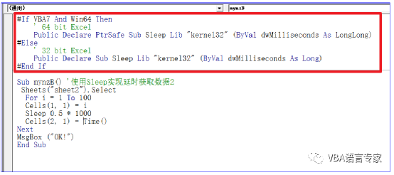 ⑤带有PtrSafe关键字的 Declare 语句为建议的语法。包括PtrSafe的 Declare 语句可同时在 32 位和 64 位平台上的 VBA7 开发环境中正确工作。为确保在 VBA7 中以及更早版本中的向后兼容性,请使用下面的构造: