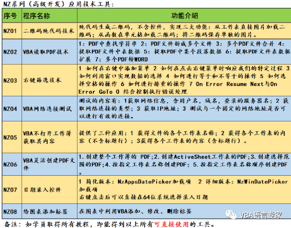 我的教程一共十套(第四套是对第一套的视频讲解),分为初级、中级、高级三大部分。是对VBA的系统讲解,从简单的入门,到数据库,到字典,到高级的网抓及类的应用。大家在学习的过程中可能会存在困惑,这么多知识点该如何组织成自己的程序呢?VBA可否能组织一个大型的程序呢?如何让VBA形成一个工具,可以拿来就用呢?其实这些早在我的考虑范围之内了,在我的教程完结后,我会陆续推出这类技术工具资料,共两个系列,一个是YZ系列,一个是NZ系列。YZ系列比较简单,学员通过学习自己完全可以实现,而NZ系列需要大家具有一定的VBA功底了。这个说明主要针对的是NZ系列。这部分的资料目前包括如下内容(点击后可以看到使用说明):
