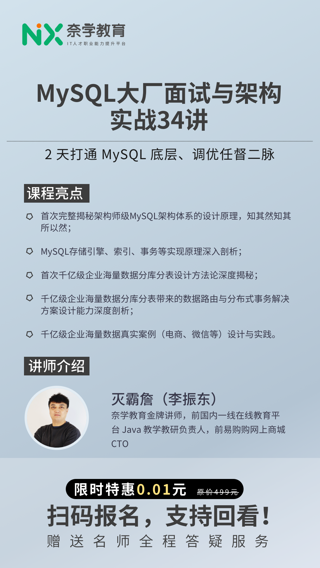 为了帮助更多开发工程师、架构师掌握MySQL核心,成功进阶大厂,玄姐携手前易购购网上商城CTO、前国内一线在线教育平台 Java 进阶课教学教研负责人和 Java 学科奠定者李振东老师,结合10多年一线大厂实践经验,对标大厂需求,打磨了一套《MySQL大厂面试与架构实战34讲》在线专栏课。2天挑战架构师级MySQL海量数据设计与实践,订阅量8W+,2天时间,掌握 MySQL 核心架构技术,并在千亿级企业真实海量数据案例中(电商、微信等),培养你的MySQL 实战能力,斩获大厂offer,实现职场进阶!